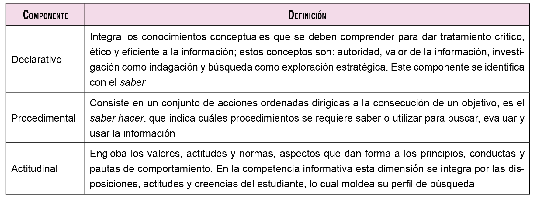 En coherencia con la perspectiva del aprendizaje estratégico y con base en los aportes de Zabala y Arnau (2014), Perrenoud (2011), Tardif (2008) y Monereo (2005), en este proyecto se entiende por competencia informativa un proceso reflexivo y estratégico que implica: a) el análisis de una situación-problema de aprendizaje sobre búsqueda y uso de información, b) la comprensión de sus alcances y c) la selección del esquema de actuación más apropiado –de entre aquellos de los que se dispone– para enfrentar estratégicamente las demandas de búsqueda, evaluación y uso de información, con base en su comprensión. El esquema de actuación moviliza de forma interrelacionada los componentes actitudinal, procedimental y declarativo de la competencia, lo que da lugar a intervenciones eficaces (ver tabla 1).
