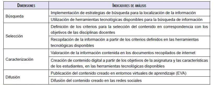 Para el diseño del diagnóstico y la conformación del cuestionario, se tomaron como dimensiones las fases planteadas por Guallar y Leiva-Aguilera (2013). Los indicadores de análisis que se asumen para el diagnóstico son los aspectos fundamentales de las fases, adecuados a la docencia universitaria. La operacionalización de la variable objeto de estudio se explica en la tabla 1.