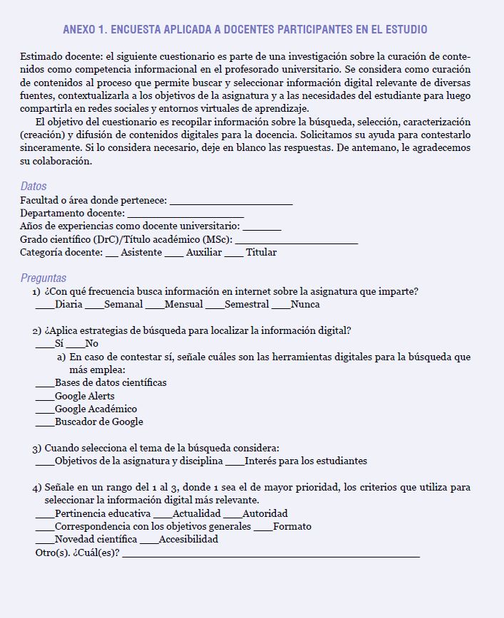 El instrumento aplicado a los docentes fue una encuesta (ver anexo 1) que permitió recopilar información sobre la búsqueda, selección, creación y difusión de contenidos digitales que el docente universitario realiza para la planificación de sus asignaturas. La encuesta se integró por once ítems, en su mayoría cerrados, aunque cinco de ellos poseían incisos abiertos para no restringir las respuestas de los encuestados a las opciones del instrumento. Las preguntas se distribuyeron de acuerdo con las dimensiones: búsqueda (3), selección (4), caracterización (3) y difusión (1).