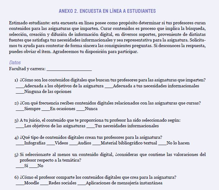 Además, se decidió incluir a estudiantes universitarios con el objetivo de contrastar si sus profesores curaban contenidos digitales para las asignaturas impartidas. En consonancia con ello, se seleccionó una muestra intencional de 80 estudiantes pertenecientes a todas las carreras que ofrecieron su disposición a participar en la investigación. De este modo, 30% de los discentes correspondía a carreras de Ciencias Técnicas, 45% a las áreas de Ciencias Sociales y 25% se formó dentro de las Ciencias Pedagógicas.