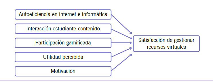 El presente estudio se realiza a partir de las investigaciones de Prensky (2001) y Siemens (2004); tiene como objetivo determinar los factores del rol estudiantil que influyen en la satisfacción de gestionar recursos virtuales. Con base en el estado del arte de las variables investigadas y en pesquisas previas, para este trabajo se identificaron cinco predictores que influyen positivamente en la satisfacción estudiantil de gestionar recursos virtuales, hipótesis que guía este estudio. Estos factores son: la autoeficacia en internet e informática, la interacción estudiante-contenido, la participación gamificada, la utilidad percibida y la motivación. A partir de estos se formó el modelo de estudio utilizado (ver figura 1).