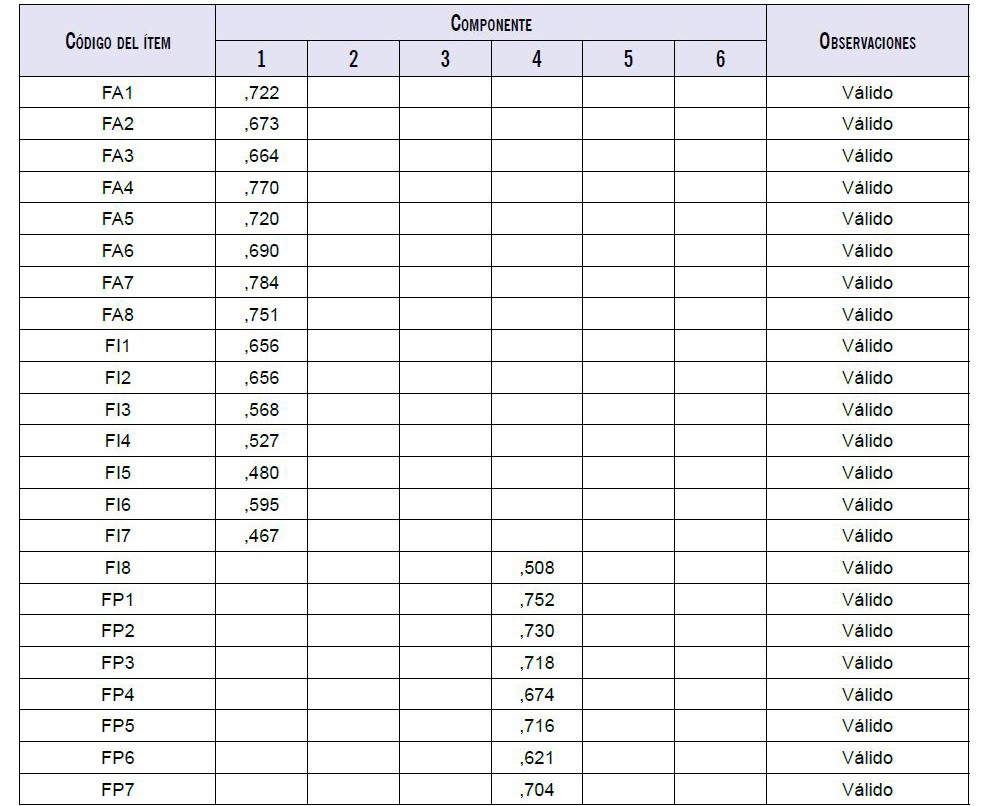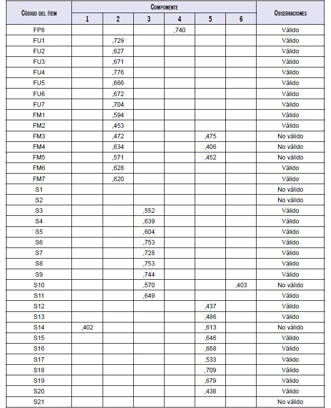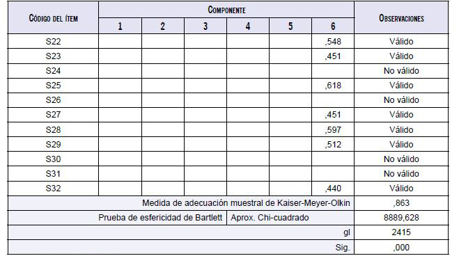 Según el hallazgo de AFC, se observa que la medida de adecuación del muestreo de Kaiser-Meyer-Olkin (KMO-SA) es de ,863, lo que indica que se puede seguir con el análisis factorial. Mientras el valor sea superior a 0,50 es aceptable; en efecto, la medida del KMO-SA fluctúa entre 0 y 1. La prueba de esfericidad de Bartlett manifiesta una medida de 8889,628 y un nivel de significancia de ,000; por lo que, según estas condiciones, se puede continuar con el análisis factorial. Los hallazgos del análisis evidencian que existen doce ítems que no obedecen a las normas de validez, estos son FM3, FM4, FM5, S1, S2, S10, S14, S21, S24, S26, S30 y S31.