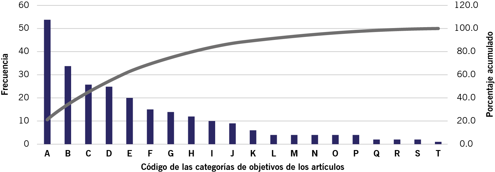 Se advierte que los objetivos de investigación se concentran en seis categorías principales, lo que representa alrededor de 70% del total, las cuales corresponden a los códigos A, B, C, D, E y F de la tabla 3; de estos destaca la categoría: retos, reflexiones, experiencias, efectos e impacto del cambio a EVEA. Asimismo, se identifican categorías poco frecuentes, como influencia de la competencia digital docente para atender la diversidad, y análisis de factores relacionados con el bienestar docente (ver figura 3).