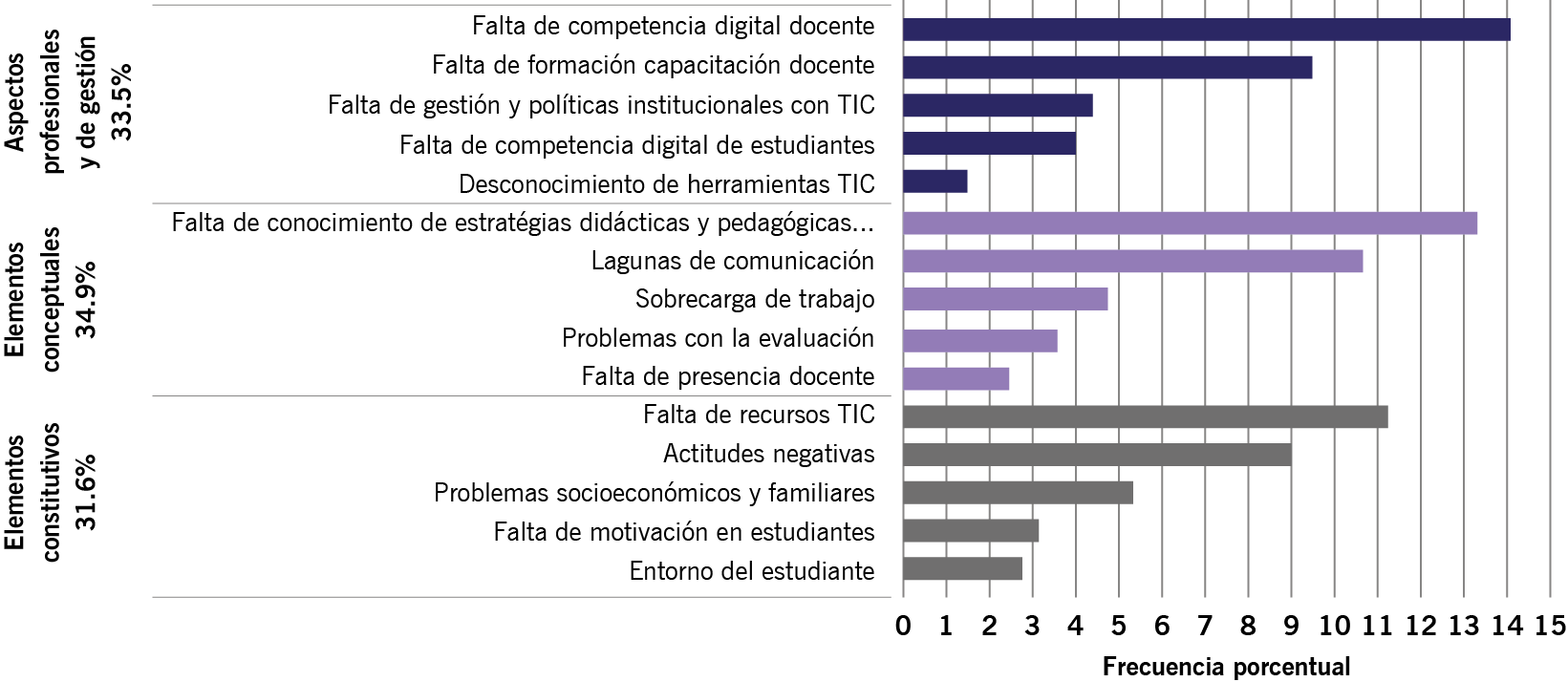 En la misma categoría se encontró un alto porcentaje sobre la falta de formación y capacitación docente. Los autores de los artículos identifican que existe una necesidad de que los docentes adquieran los conocimientos y las habilidades para crear contenido digital, utilizar las herramientas TIC con mayor destreza y facilidad, y adquirir los conocimientos tecnopedagógicos y curriculares para aplicar estrategias; esto, a la par, permitiría que hagan uso más eficiente y eficaz de las plataformas de aprendizaje, ya que la mayoría las emplea como repositorio o se les dificulta su manejo (Brenis et al., 2021; Quiñonez et al., 2021; Saldaña, 2020). De acuerdo con la OCDE (2020), muchos profesores reportan haber tenido capacitación en el uso de las TIC, afirmación que contrasta con los resultados, por lo que es necesario revisar cómo y en qué se les ha capacitado.