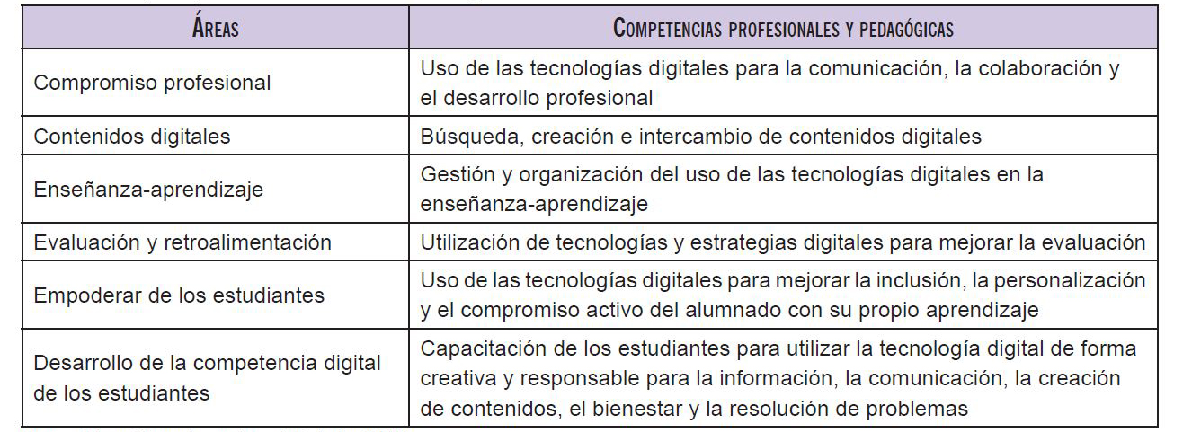 Tabla 2. Áreas y competencias docentes conforme a DigComEdu