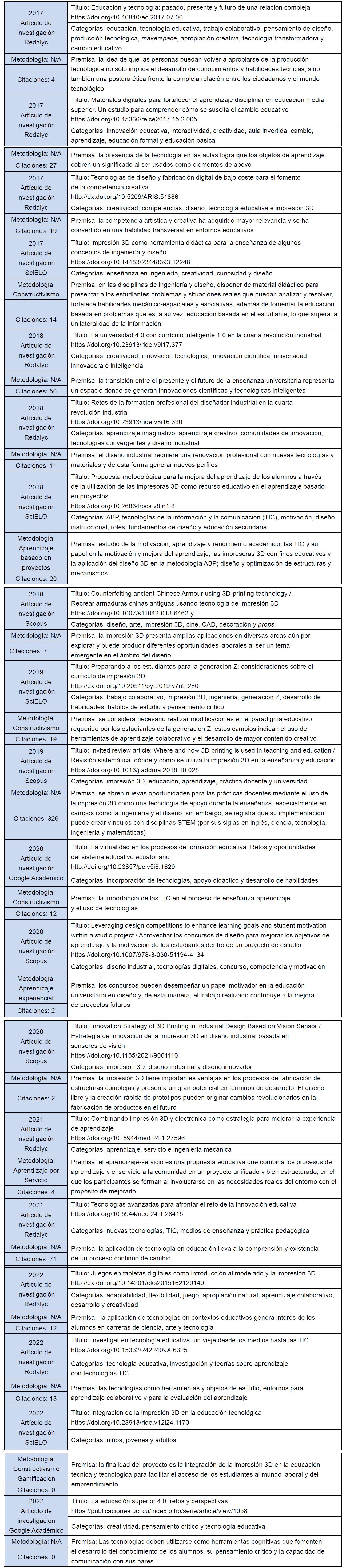 Este trabajo de investigación llevó a cabo una revisión de la literatura en un lapso que comprende desde 2017 hasta 2022, incluyendo el período anterior a la pandemia provocada por la covid-19, ya que la impresión 3D se consideraba una de las tendencias en la educación; sin embargo, se observa que su apropiación se vio interrumpida ante la contingencia debido a las medidas de confinamiento y al nulo acceso al equipo en los laboratorios institucionales. Cabe mencionar que tras esta situación se ha retomado su uso en aplicaciones recientes.
