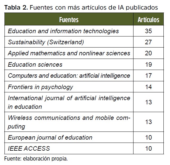 En cuanto a las revistas académicas se recuperaron 390 fuentes donde la diferencia entre la cantidad de artículos varió en una media de 2.27 artículos, donde la fuente Education and information technologies tuvo la mayor cantidad de estudios (n = 35), seguido de Sustainability (Switzerland) (n = 27) y posteriormente Applied mathematics and nonlinear sciences (n = 20). Un dato relevante por mencionar es que entre la totalidad de fuentes encontradas, la tendencia de publicación es un artículo, ya que 252 fuentes tuvieron al menos un artículo sobre IA en educación (ver tabla 2).