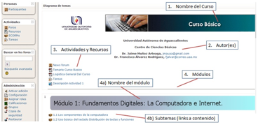 Para facilitar el acceso y seguimiento de los contenidos, se estableció una estructura básica para los módulos que conforman los cursos (básico e intermedio): nombre del curso (básico o intermedio); autores (para el programa piloto, asociados a la investigación, aunque se espera que las facilitadoras sean las autoras de módulos consecuentes y sus contenidos); lista de actividades y recursos disponibles para el curso en cuestión; módulos del curso en cuestión (asociados directamente a los temas en la retícula para cada curso); título del módulo correspondiente; subtemas del módulo (dispuestos como links a los contenidos correspondientes); actividades; ejercicios y evaluación; y menú de herramientas de Moodle activas para el curso en cuestión.