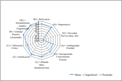 Sin embargo, entre los indicadores que muestran un nivel bajo está la A (+,-) ambigüedad, con un valor de 0.38, que revela una falta de profundización en las ideas y argumentos presentados como réplicas a otras aportaciones. Mediante la provocación al debate de ideas y el uso de preguntas socráticas, se logra la ambigüedad de ideas, posturas y argumentaciones. Sobre este punto, el aprendizaje a través de la práctica en diversos foros de discusión con diseños en fases y la incorporación de preguntas socráticas eleva su nivel de provocación al debate y profundidad de argumentación, lo que refleja un mayor nivel de claridad y puntualización de ideas y el alejarse de la ambigüedad en sus aportaciones.