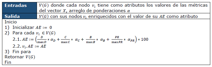 Para el cálculo de la AE se considera la centralidad de grado (D), porque representa la popularidad (cantidad de contactos) del usuario, y la centralidad de cercanía (C), pues permite identificar lo rápido que se puede relacionar este usuario con los demás. Asimismo, se considera la centralidad de intermediación (B), porque permite detectar aquellos usuarios que conectan las distintas comunidades que se forman en la red, y el PageRank (PR) ya que posibilita la identificación de la importancia del usuario a partir de la relevancia de sus contactos. Los valores de estas métricas se encuentran unificados al utilizar la técnica normalización por el mayor elemento y luego son combinados mediante el operador de agregación media ponderada. Luego de aplicar el operador de agregación, el resultado es multiplicado por 100 para que los valores de la AE se encuentren en el intervalo [0,100] [0,100] . La fórmula general para calcular la AE es la siguiente (ver fórmula 8).