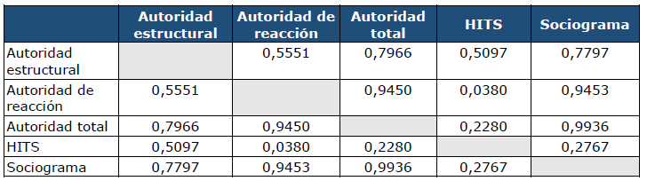 Finalmente, se determinó la correlación existente entre estos valores mediante los coeficientes de correlación de Pearson y Spearman, y se identificaron relaciones precisas entre ellos. De esta manera se puede evaluar el cumplimiento de la hipótesis de investigación, al poder comparar los resultados obtenidos en cada caso, entre el algoritmo desarrollado, el algoritmo HITS y un sociograma, al ser estos dos últimos técnicas asentadas. Se desea demostrar que el algoritmo desarrollado es válido para medir y analizar adecuadamente la autoridad e influencia que ejercen los usuarios en las redes sociales y profesionales.