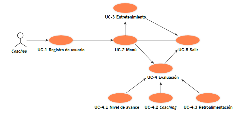 Un caso de uso es una notación de Unified Modeling Language (UML), que define el comportamiento de un sistema por medio de una secuencia de acciones que ejecuta, donde el usuario –o usuarios– interactúan con este. A partir del grado de especificidad de análisis, también se pueden incluir las variaciones del comportamiento del sistema para generar un resultado observable por el actor que interactúa con este (Jacobson, Rumbaugh & Booch, 2007). Esto se ejemplifica en la figura 2, caso de uso general del sistema coaching y en la tabla de secuencia del flujo del sistema (ver tabla 1).