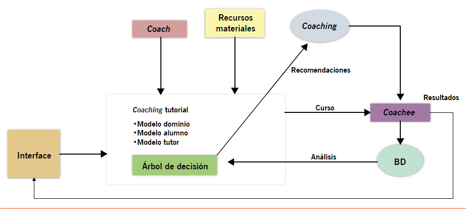 Módulo del tutor: es el encargado de monitorear, con base en el desempeño académico del coachee, cuáles son las sugerencias más adecuadas en cuanto a los recursos pedagógicos. Esta información es proporcionada por medio de la aplicación del algoritmo árbol de decisión, vinculado con el módulo del dominio del sistema coaching tutorial, y se encarga de reforzar los contenidos en los que se manifestó alguna problemática.