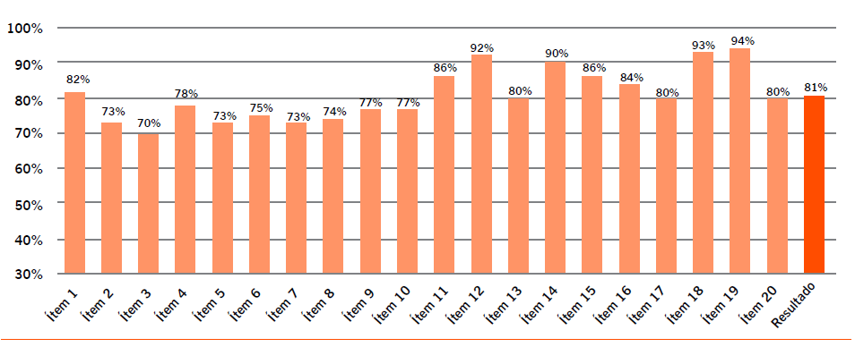 Los reactivos restantes recibieron una ponderación promedio de entre 4.0-4.7. Estas preguntas se categorizaron de acuerdo con los contenidos del tema. Con estas calificaciones, el software obtuvo una puntuación entre 90% y 94%, que lo sitúa como “muy adecuado”. Al conjuntar el promedio de todos los reactivos, la calificación final es de 4.04, lo que da como resultado un promedio de 81%, que se considera “muy bueno”.