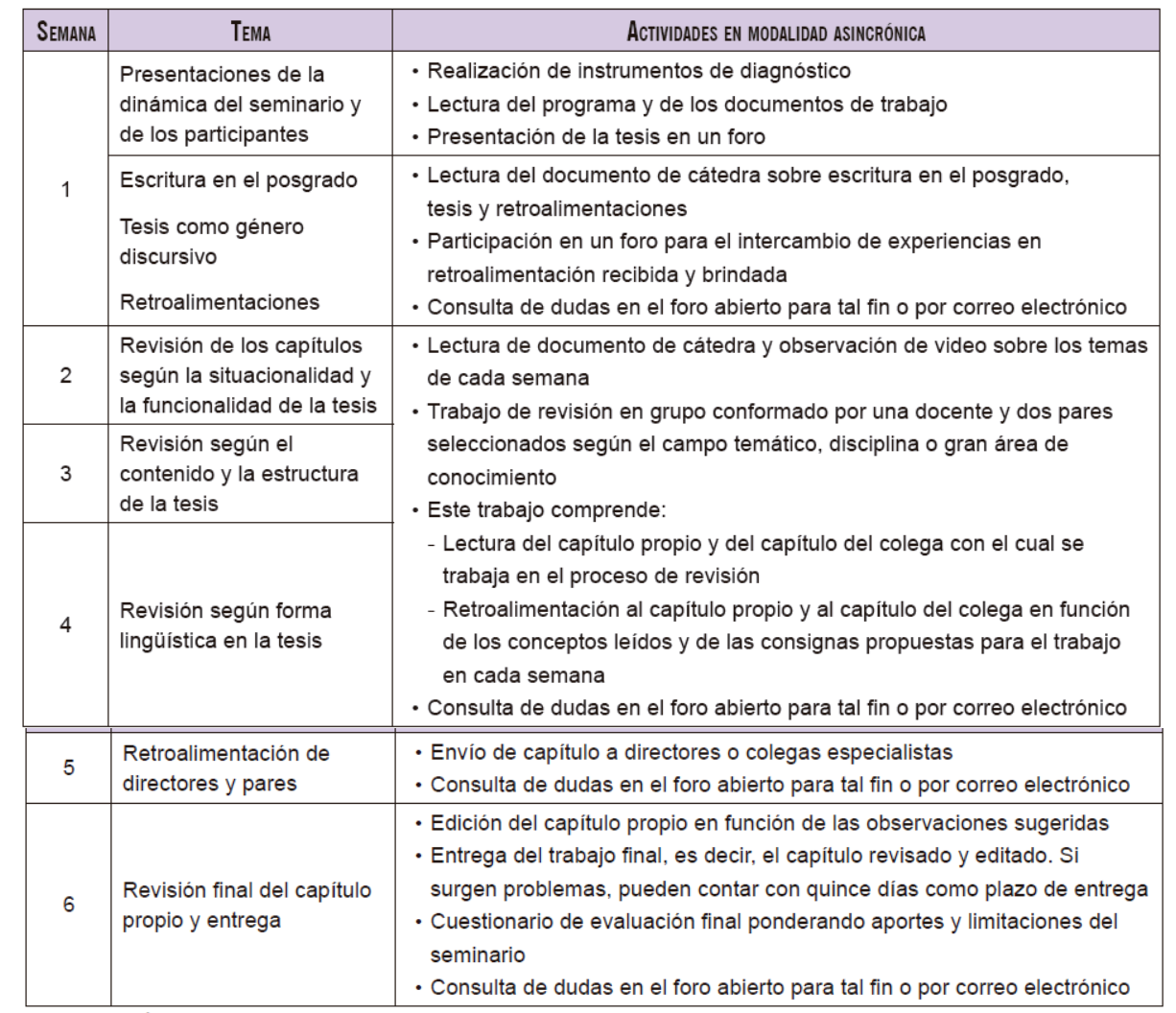 Al seguir estos lineamientos, el seminario se caracteriza por la modalidad de taller en sus tres ediciones. Para su desarrollo, se dispone de un espacio en la plataforma Moodle institucional, que se articula con documentos compartidos en Google Drive, con bibliografía especialmente seleccionada en formato PDF y materiales del curso (textos y videos). Se usan los documentos compartidos para leer los capítulos y añadir retroalimentaciones en el texto, y los foros de Moodle (uno por capítulo de cada estudiante) para retroalimentaciones más globales. Además, para la comunicación con el grupo, las docentes proponen el uso de correo electrónico y, para el encuentro sincrónico, Google Meet. En cada semana del seminario se realizan tareas específicas, según se muestra en la tabla 1.