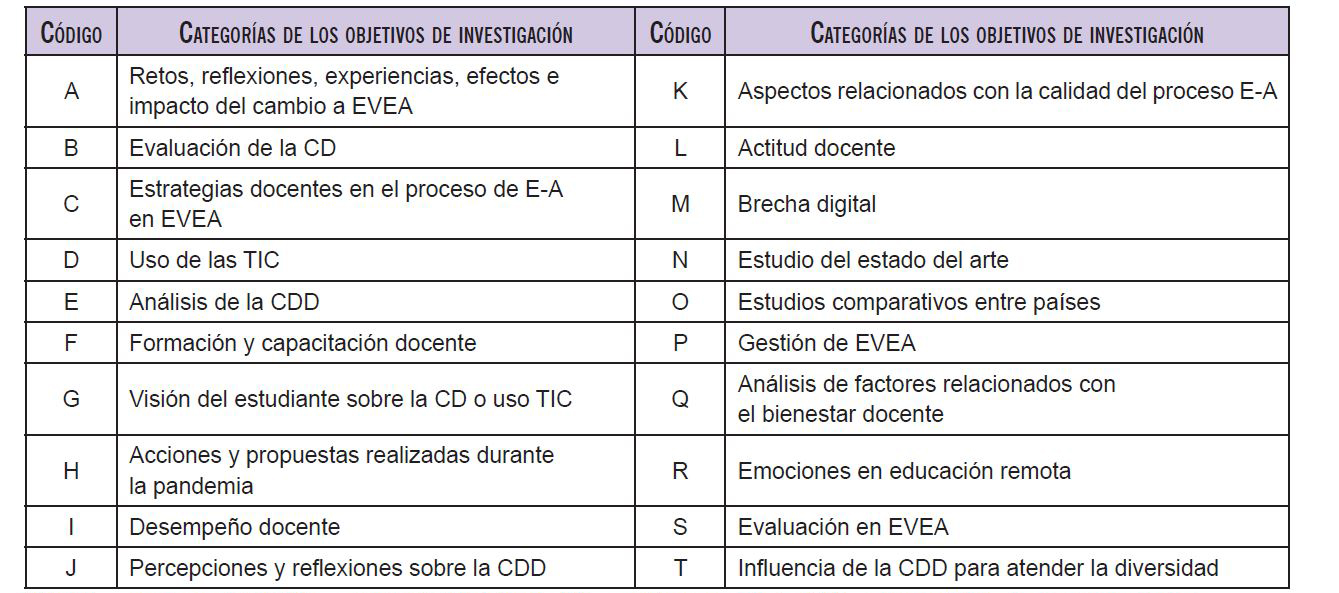 Se advierte que los objetivos de investigación se concentran en seis categorías principales, lo que representa alrededor de 70% del total, las cuales corresponden a los códigos A, B, C, D, E y F de la tabla 3; de estos destaca la categoría: retos, reflexiones, experiencias, efectos e impacto del cambio a EVEA. Asimismo, se identifican categorías poco frecuentes, como influencia de la competencia digital docente para atender la diversidad, y análisis de factores relacionados con el bienestar docente (ver figura 3).
