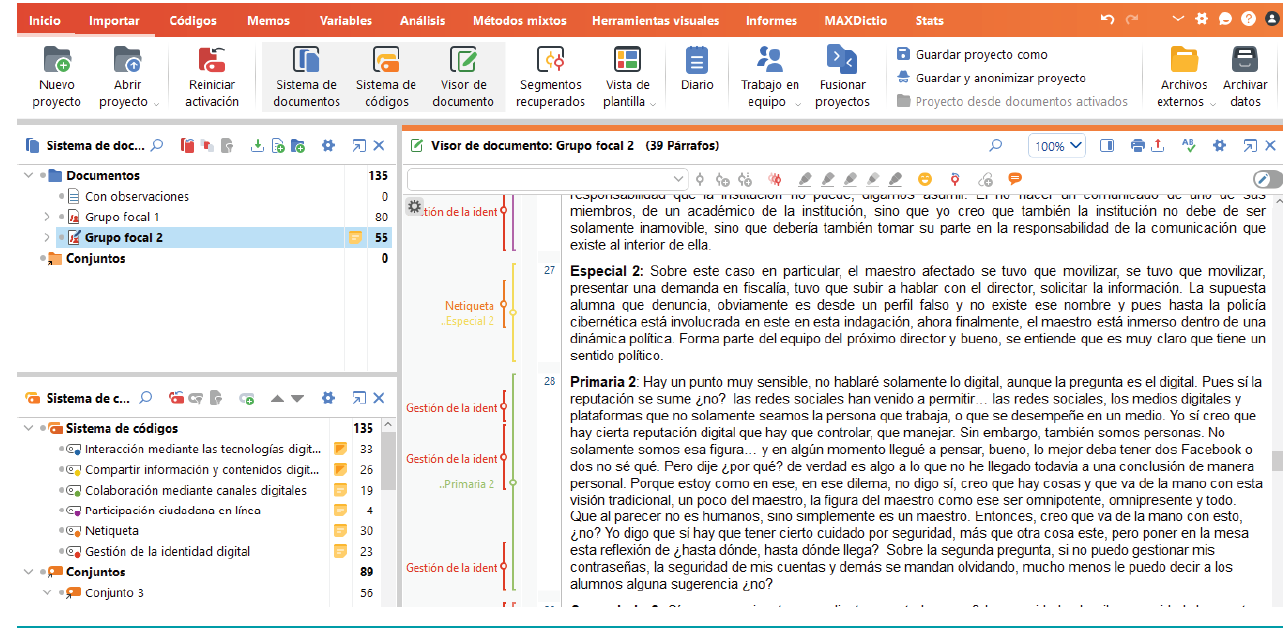 La sesión fue grabada en audio a través de un dispositivo celular de alta gama, el cual se puso frente a los participantes. Asimismo, se grabó en video mediante la aplicación Zoom, utilizando los recursos de cámara y micrófono ambiental localizados sobre los participantes. Posteriormente, la información fue transcrita para su análisis, el cual se realizó a través del programa MAXQDA 2022. En la figura 1 se puede observar la pantalla de análisis del programa.