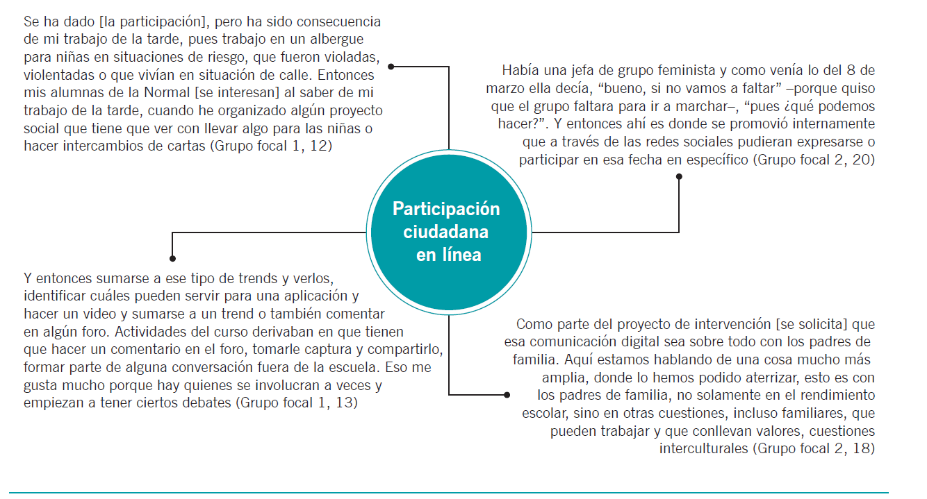 De acuerdo con la INTEF (2017), la competencia de participación ciudadana en línea es: “implicarse con la sociedad mediante la participación en línea, buscar oportunidades tecnológicas para el empoderamiento y el auto-desarrollo en cuanto a las tecnologías y a los entornos digitales, ser consciente del potencial de la tecnología para la participación ciudadana” (p. 29). Esta competencia tuvo poca recuperación de información, incluso algunos de los participantes no aportaron ninguna experiencia al respecto, por lo que no se reconoció que la institución promoviera la participación ciudadana en línea (ver figura 5).