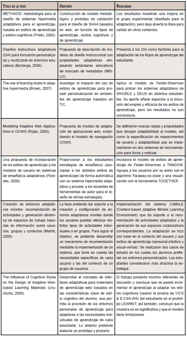 De la articulación entre los campos de los estilos de aprendizaje e inteligencia artificial (adaptativo y agentes inteligentes) se identificaron palabras clave que orientaron la búsqueda para la exploración de este estado del arte. Las indagaciones se construyeron en tesis de doctorado y artículos de divulgación científica. Por lo que se refiere al sondeo de tesis de doctorado, se revisaron repositorios de los que destacan las producciones de Reino Unido y España. La tabla 2 resume las tesis doctorales encontradas en la exploración inicial para la construcción parcial del estado del arte.