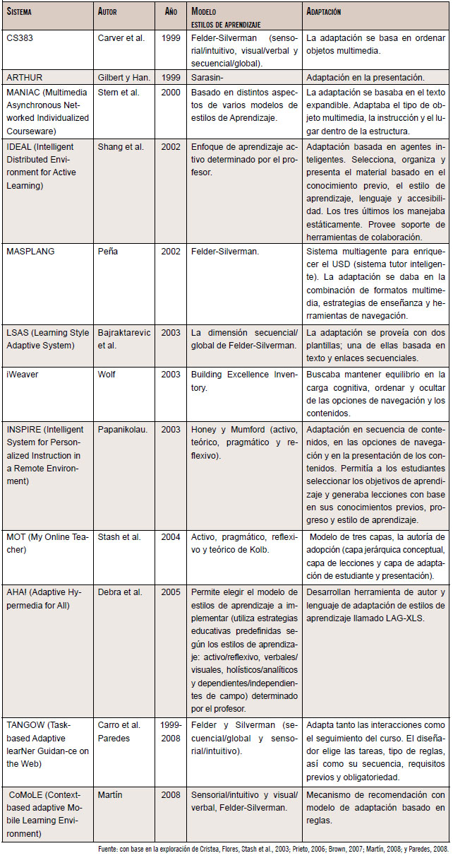 En la búsqueda, identificamos diversos prototipos cuyos principales objetivos son la personalización de la experiencia de aprendizaje basada en el perfil de estilos de aprendizaje del alumno; los principales son: CS-383, ARTHUR, MANIAC, IDEAL, MASPLANG, LSAS, INSPIRE, MOT, AHA!, TANGOW y CoMoLE (ver tabla 3). Los mencionamos como otro aspecto a indagar y profundizar para luego identificar los diferentes aportes en el desarrollo de los trabajos mencionados.