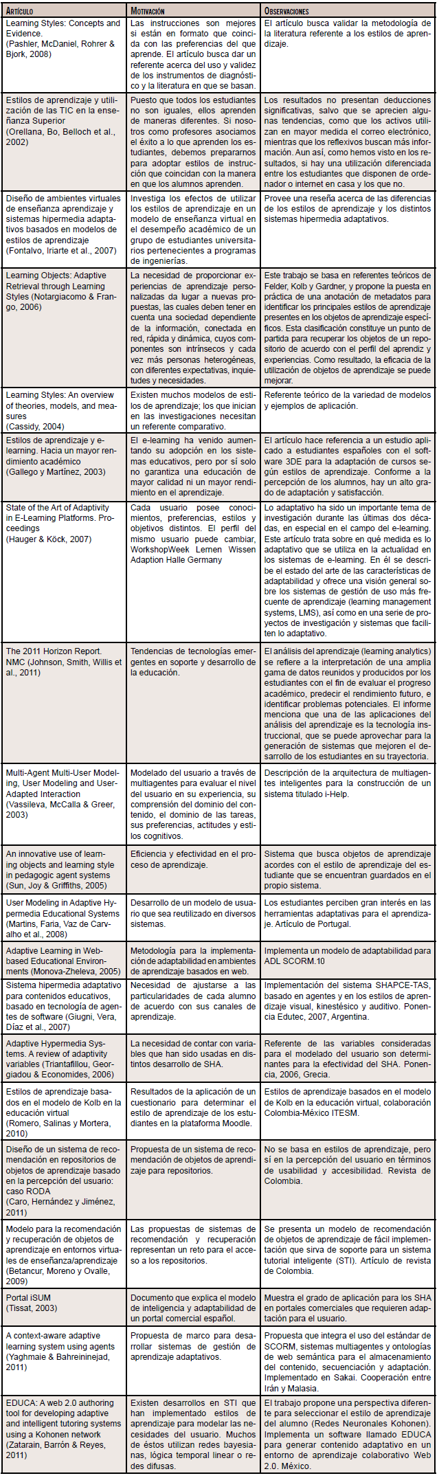 Fuente: con base en la exploración de Cristea, Flores, Stash et al., 2003; Prieto, 2006; Brown, 2007; Martín, 2008; y Paredes, 2008. Prieto (2006) presenta una metodología titulada METHADIS, la cual tiene como objetivo diseñar estrategias instruccionales adaptativas (diseño instruccional adaptativo) para SHA basadas en estilos de aprendizaje y estilos cognitivos. La metodología citada puede ser un referente importante para el desarrollo de estrategias y su implementación en SHAE. Para la exploración de artículos, procedimos a recuperar referencias desde Google Académico, RedaLyC, Dialnet9 y varias herramientas de tipo metabuscador. Las palabras clave fueron las mismas aplicadas para la recuperación de tesis. En la tabla 4 presentamos un resumen de la exploración.