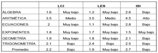 - El conocimiento alto, que corresponde a la calificación más alta, se presenta en el rubro de la aritmética, en el que destacan los alumnos de ingeniería, similar a los alumnos de Comercio Internacional y Educación para la Salud. El conocimiento matemático de álgebra oscila en los niveles de muy bajo a bajo.