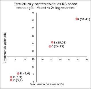Como puede observarse, la estructura y el contenido de las representaciones sociales de los sujetos que aprobaron el curso de ingreso son prácticamente idénticas a las de los aspirantes (muestra I). En el núcleo de las representaciones de estos sujetos emergen nuevamente tres categorías: A (tecnología computacional y telefonía celular) (39,41); B (bienestar inmediato) (25,26); y C (progreso e innovación globalizados) (24,23) con coordenadas muy similares a las de la muestra anterior. Lo mismo ocurre con la ubicación en la que aparecen el resto de las categorías: las categorías E (visión apocalíptica) (6, 6); F (condiciones necesarias y actividades asociadas a su existencia) (3,3); y D (valoraciones morales) (3,1) surgen en posiciones relativas muy semejantes a las del caso anterior.