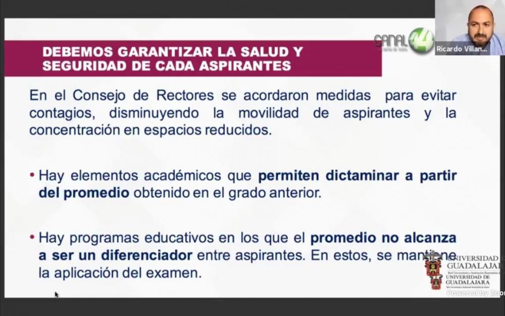 Con estas medidas, únicamente 29 por ciento de los aspirantes a licenciaturas en la UdeG aplicarán examen de admisión. Es decir, solamente 40 mil 845 de un total de 140 mil 359 aspirantes, informó en rueda de prensa virtual el Rector General de esta Casa de Estudio, doctor Ricardo Villanueva Lomelí.