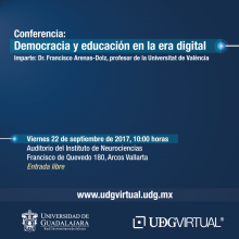 “Democracia y educación en la era digital” es el tema de la conferencia que dictará el profesor del departamento de Filosofía de la Universidad de Valencia, doctor Francisco Arenas-Dolz, invitado del cuerpo académico Comunicación y Cultura tecnológica y del doctorado en Sistemas y Ambientes Educativos de UDGVirtual.