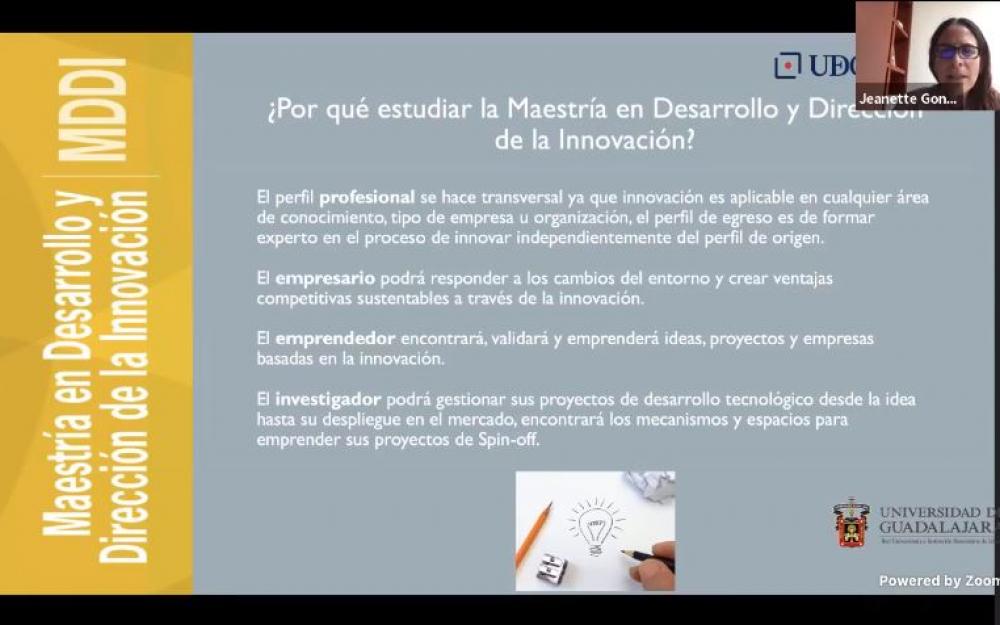El perfil profesional se hace transversal porque la innovación es aplicable en cualquier área del conocimiento, tipo de empresa u organización, que es lo que demanda el mercado laboral actualmente, dijo la coordinadora de la maestría en Desarrollo y Dirección de la innovación de UDGVirtual, la maestra Jeanette González Díaz.