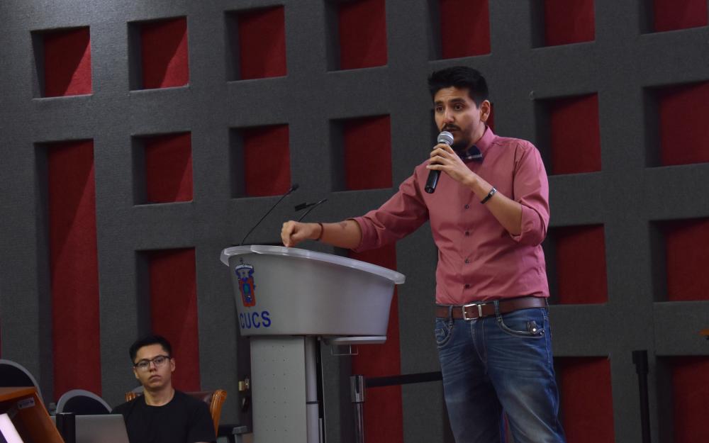 La charla tuvo lugar en el auditorio “Dr. Roberto Mendiola Orta”, en el marco de las jornadas de emprendimiento “Empren-CUCS”, que se desarrollan del 12 al 14 de marzo.