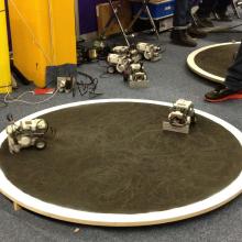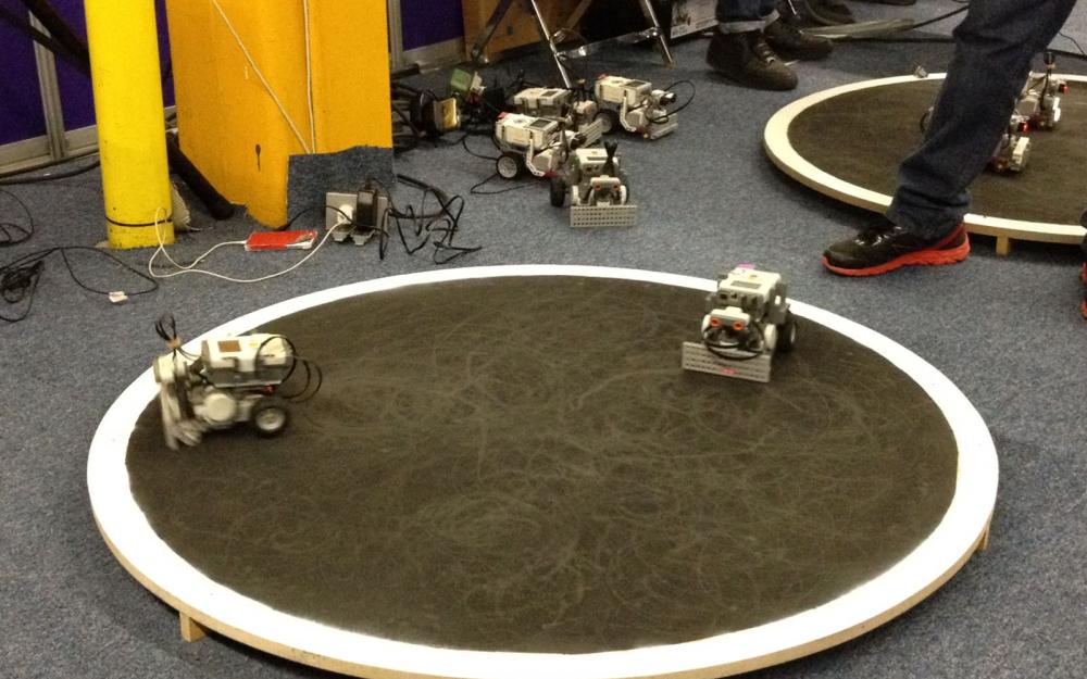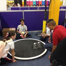 En el pabellón de UDG Virtual los niños participan en un torneo de Sumo-bot, en el que deben programar a su robot para enfrentarse a otro, en un ring japonés.