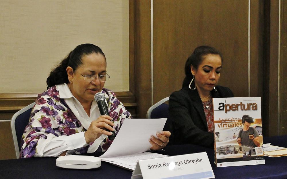 Por parte de la editorial de UDGVirtual, se dieron a conocer los nuevos números las revistas de tecnología y sociedad Paakat y Córima y la de innovación educativa denominada Apertura. Para ello se contó con la presencia de la doctora Sonia Reynaga Obregón, coordinadora general académica de la UdeG, así como de la maestra Alicia Zúñiga Llamas, coordinadora editorial del SUV.