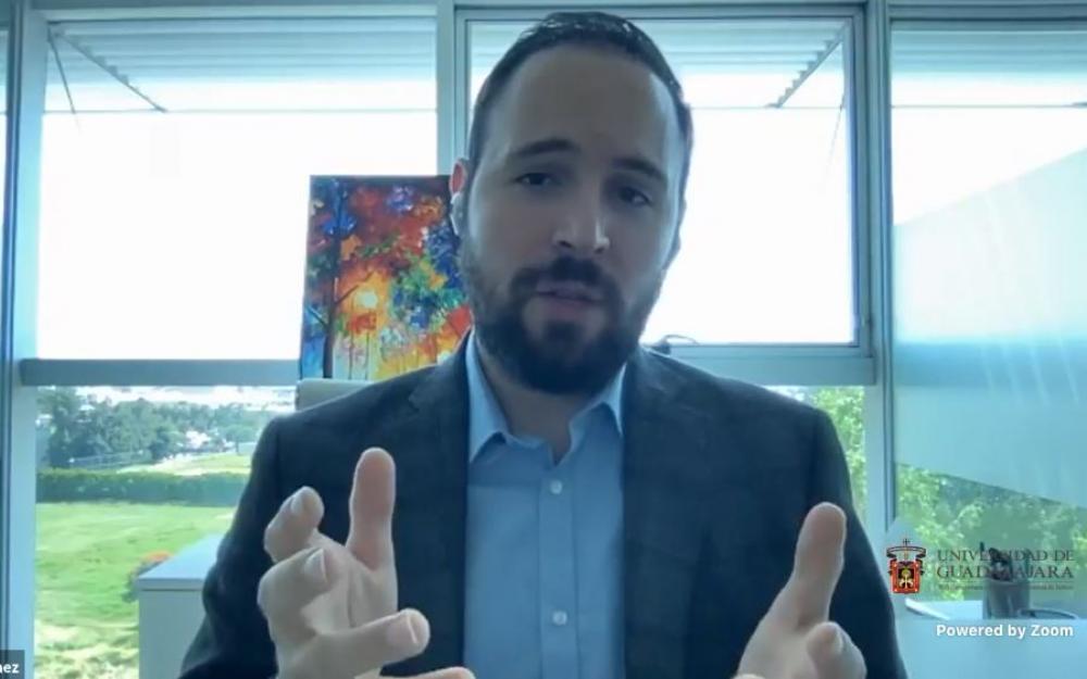 Gómez Bayardo impartió una charla en vivo, organizada por la coordinación de la maestría, en la que habló sobre su experiencia en el desarrollo de un Centro de Innovación industrial para el desarrollo de dispositivos médicos, como parte del trabajo que realiza en el Clúster de Ingeniería Biomédica del Estado de Jalisco.