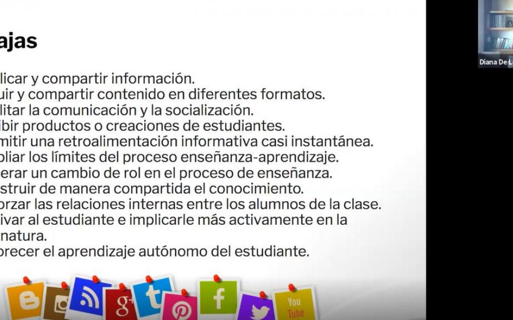 De acuerdo con la académica, entre las ventajas de las redes sociales se encuentra la posibilidad de incluir y compartir material en diferente formato, la facilidad para exhibir el material creado por los estudiantes, la retroalimentación casi instantánea, y que sirven como motivación para que el alumno participe activamente en la clase.